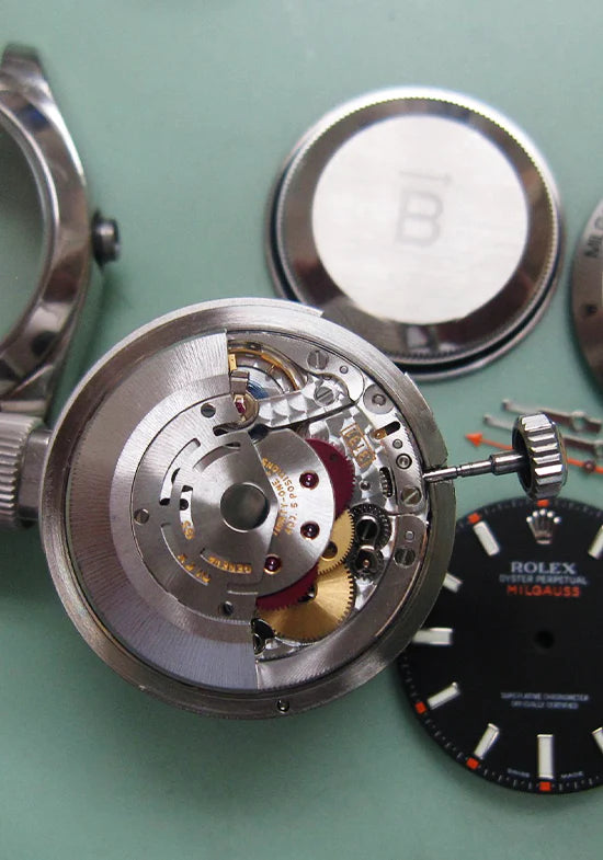 Our Rolex service includes complete hand disassembly of all exterior components and of all systems of the movement. The typical Rolex movement is compromised of more than 100 individual components. These tiny interconnected parts work in harmony day after day and year after year to keep your watch displaying the correct time. Part of that service includes, ultrasonic cleaning, epilame treatment, lubrication, gasket replacement, water-pressure testing, factory refinish/polish (optional)