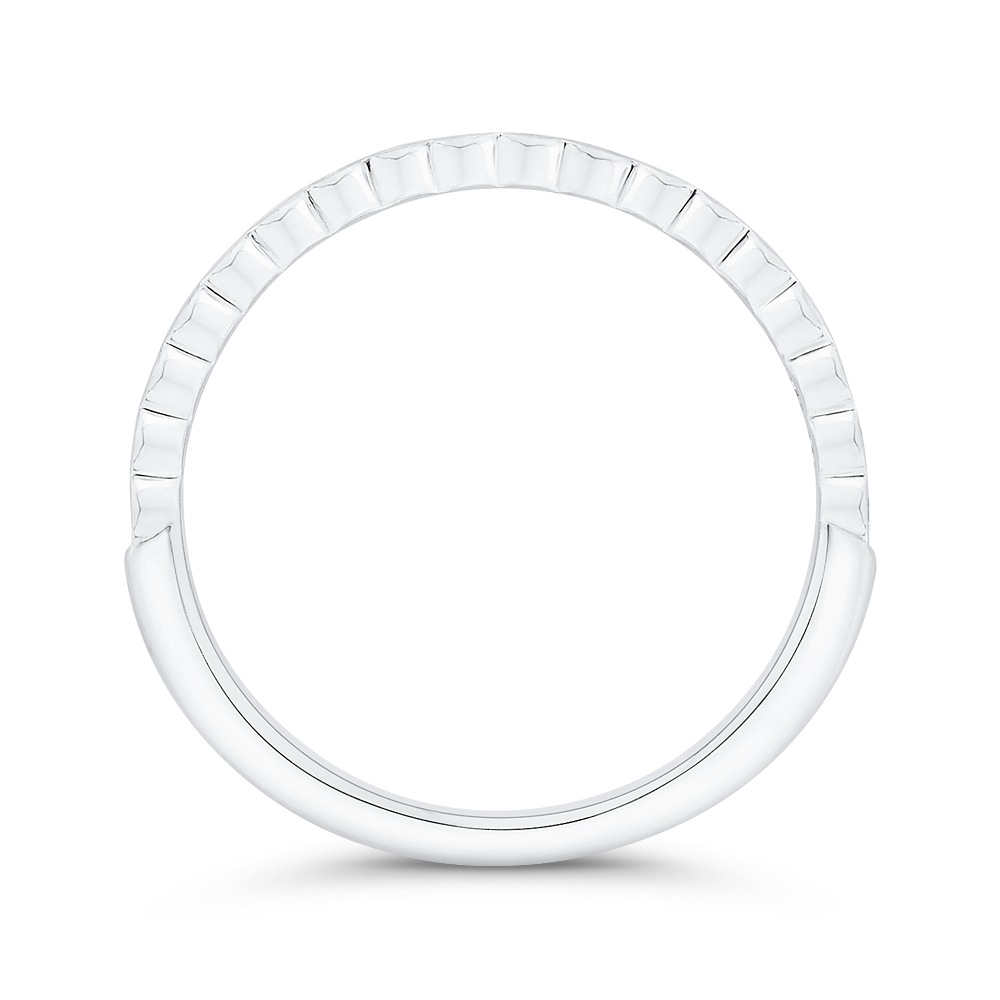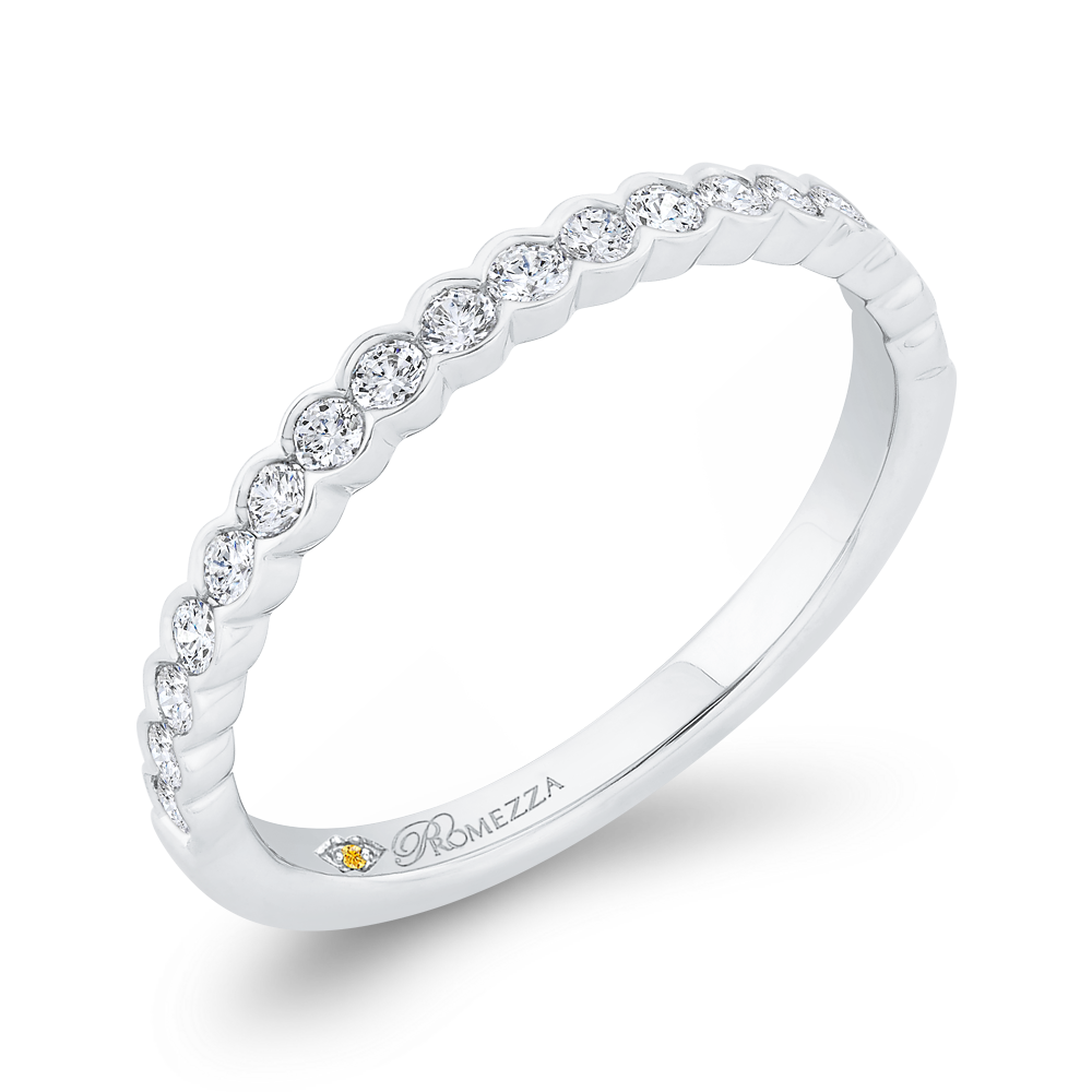 This exquisite wedding band features a row of dazzling diamonds set in a sleek and timeless bezel setting. Crafted in lustrous 14K white gold, this elegant piece is the perfect symbol of everlasting love and commitment. A stunning choice for those seeking a classic and sophisticated wedding ring.