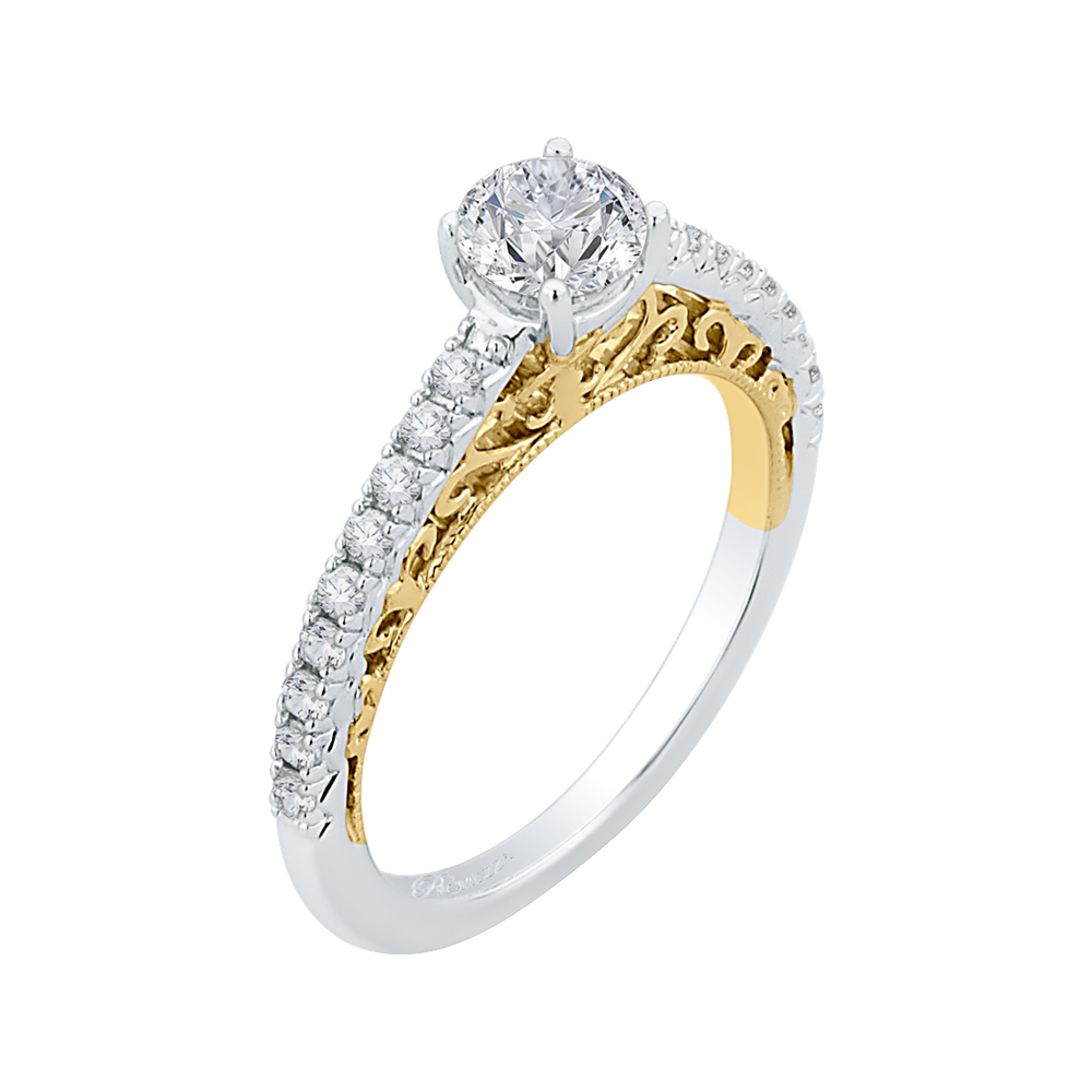 This exquisite diamond engagement ring is crafted in 14K two tone gold, combining the timeless elegance of yellow gold with the modern allure of white gold. The dazzling round-cut diamond centerpiece is sure to capture the heart of your beloved, symbolizing your eternal love and commitment. A truly luxurious and sophisticated choice for a proposal that will be cherished for a lifetime.