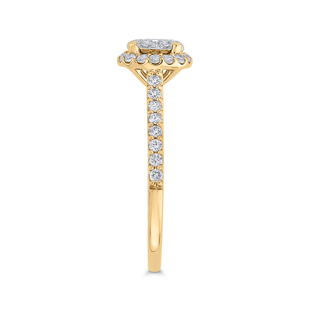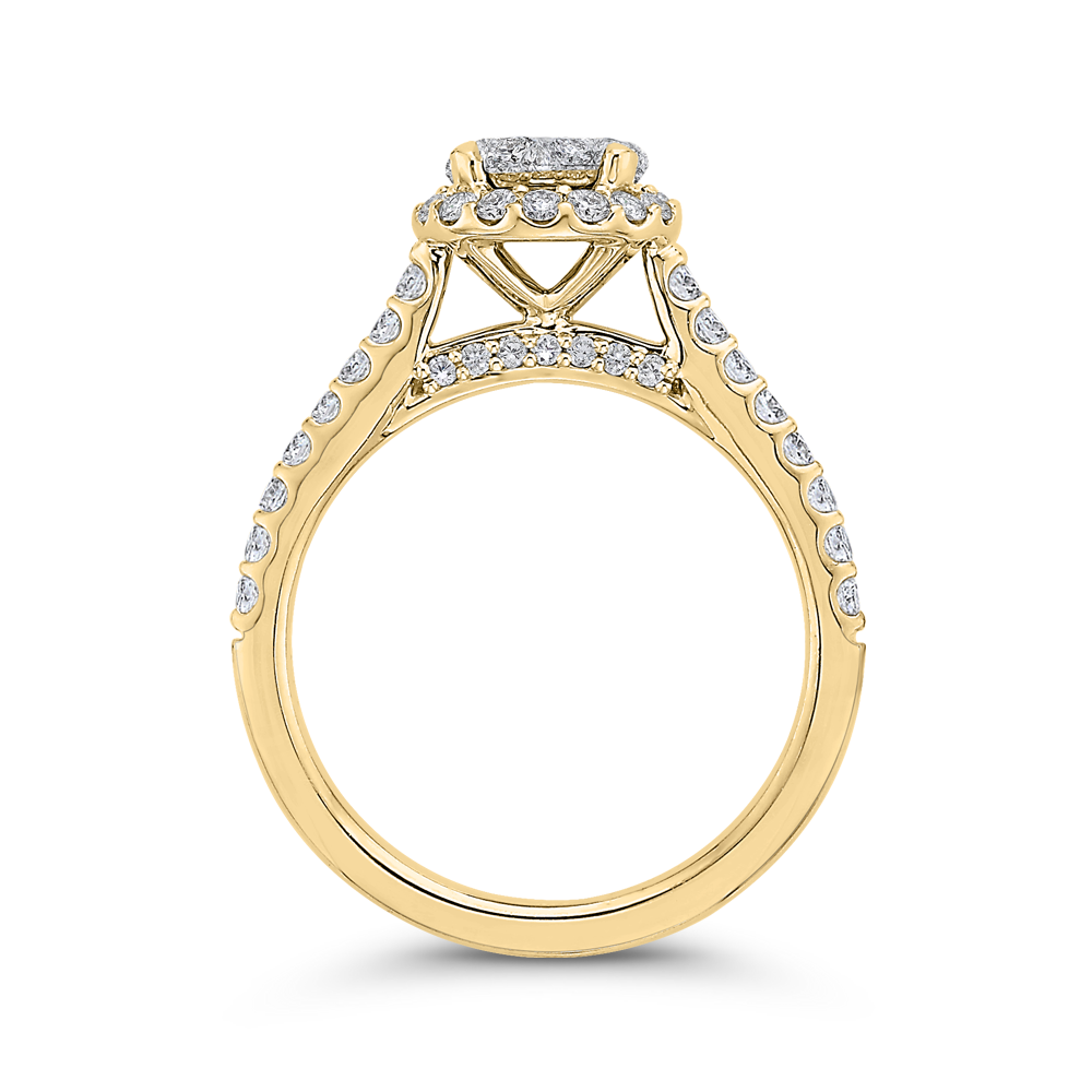 This exquisite diamond halo engagement ring exudes timeless elegance and sophistication. Crafted in 14K two tone gold, the stunning contrast of white and yellow gold adds a touch of luxury to the design. The sparkling halo of diamonds surrounding the center stone creates a dazzling and romantic look that will surely capture her heart.