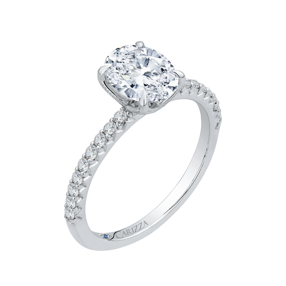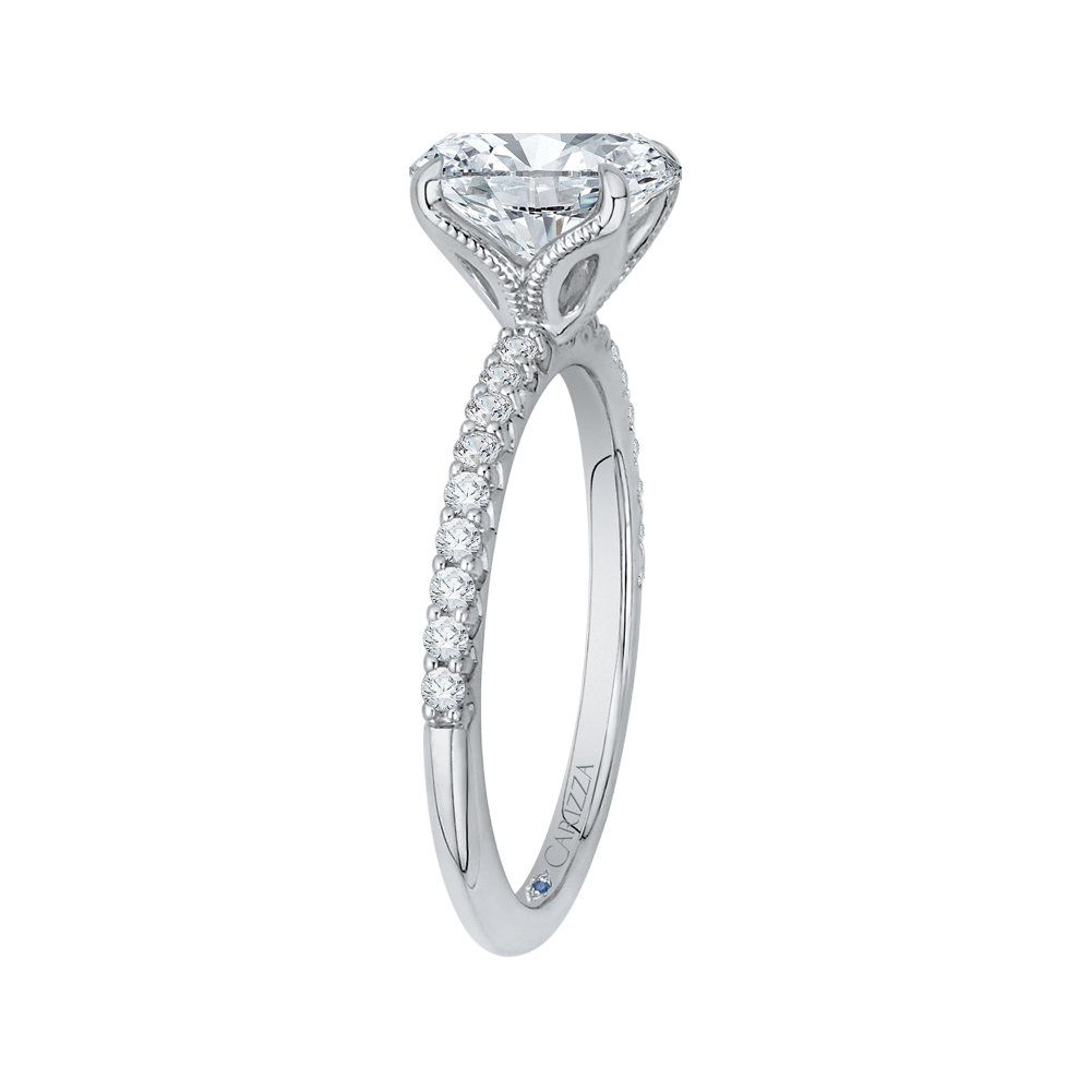 This exquisite oval cut diamond floral engagement ring in 14K white gold is a timeless symbol of love and commitment. The intricate floral design adds a touch of elegance and femininity to this stunning piece. With its semi-mount setting, this ring allows you to choose the perfect center stone to create a truly personalized and unique engagement ring.
