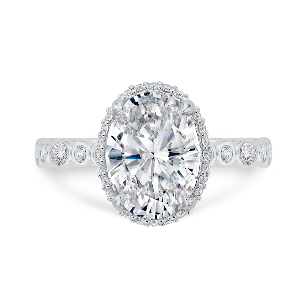 This exquisite oval cut diamond halo engagement ring exudes timeless elegance and sophistication. Crafted in lustrous 18K white gold, the semi-mount setting allows you to choose the perfect center stone to symbolize your love. The sparkling halo of diamonds surrounding the center stone adds a touch of glamour and luxury to this stunning piece.