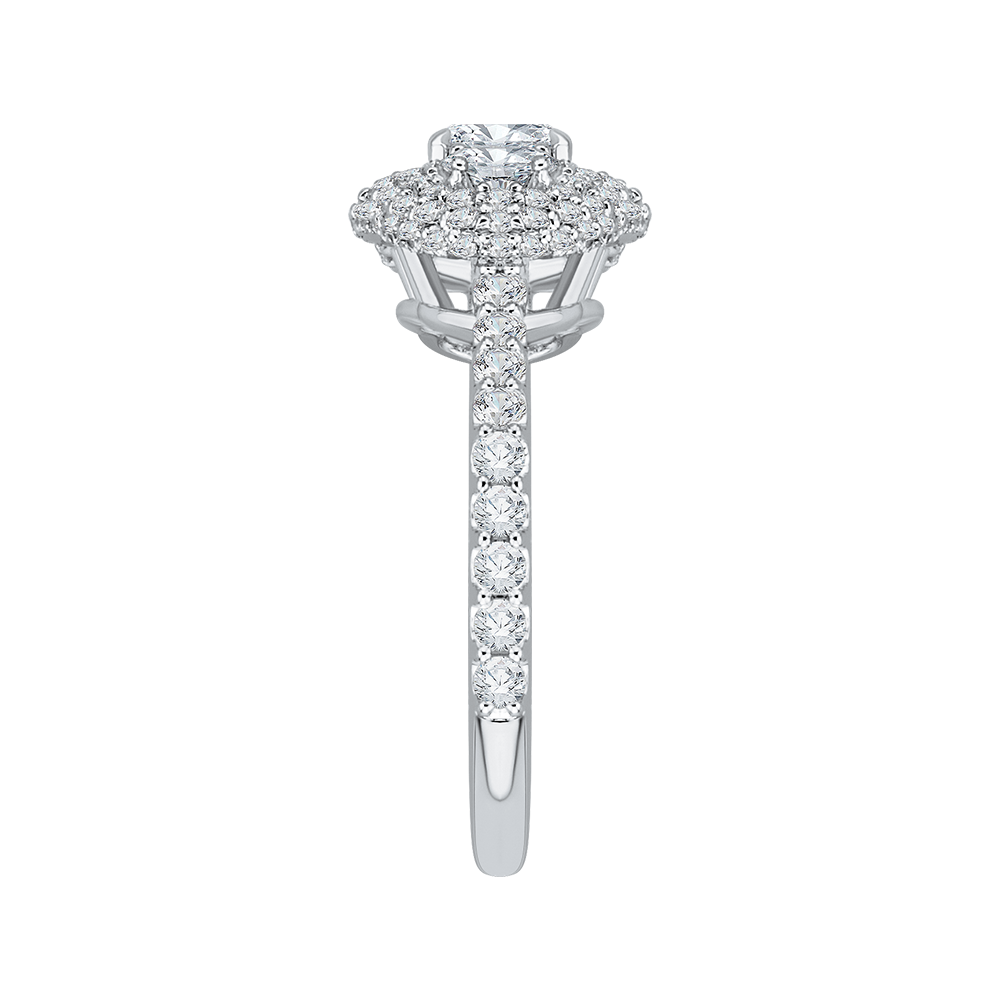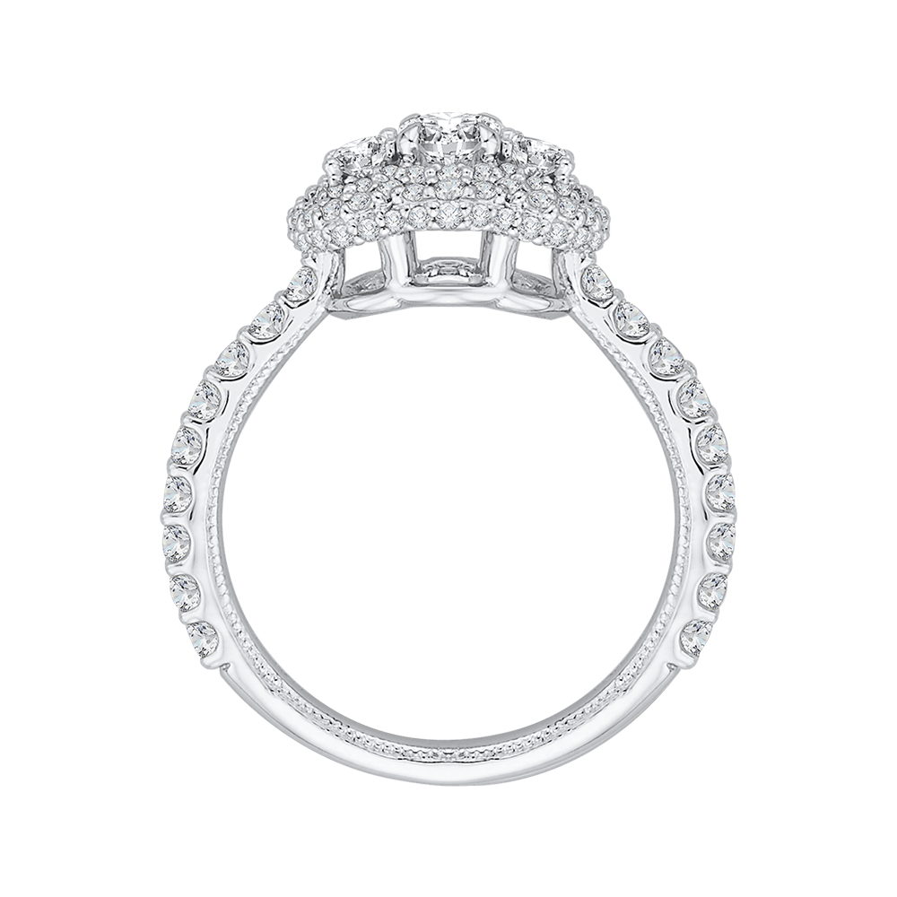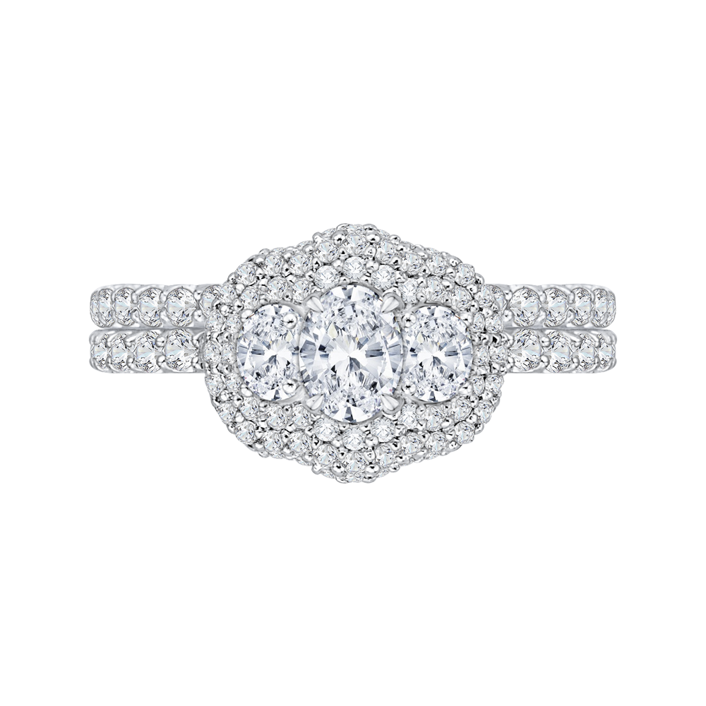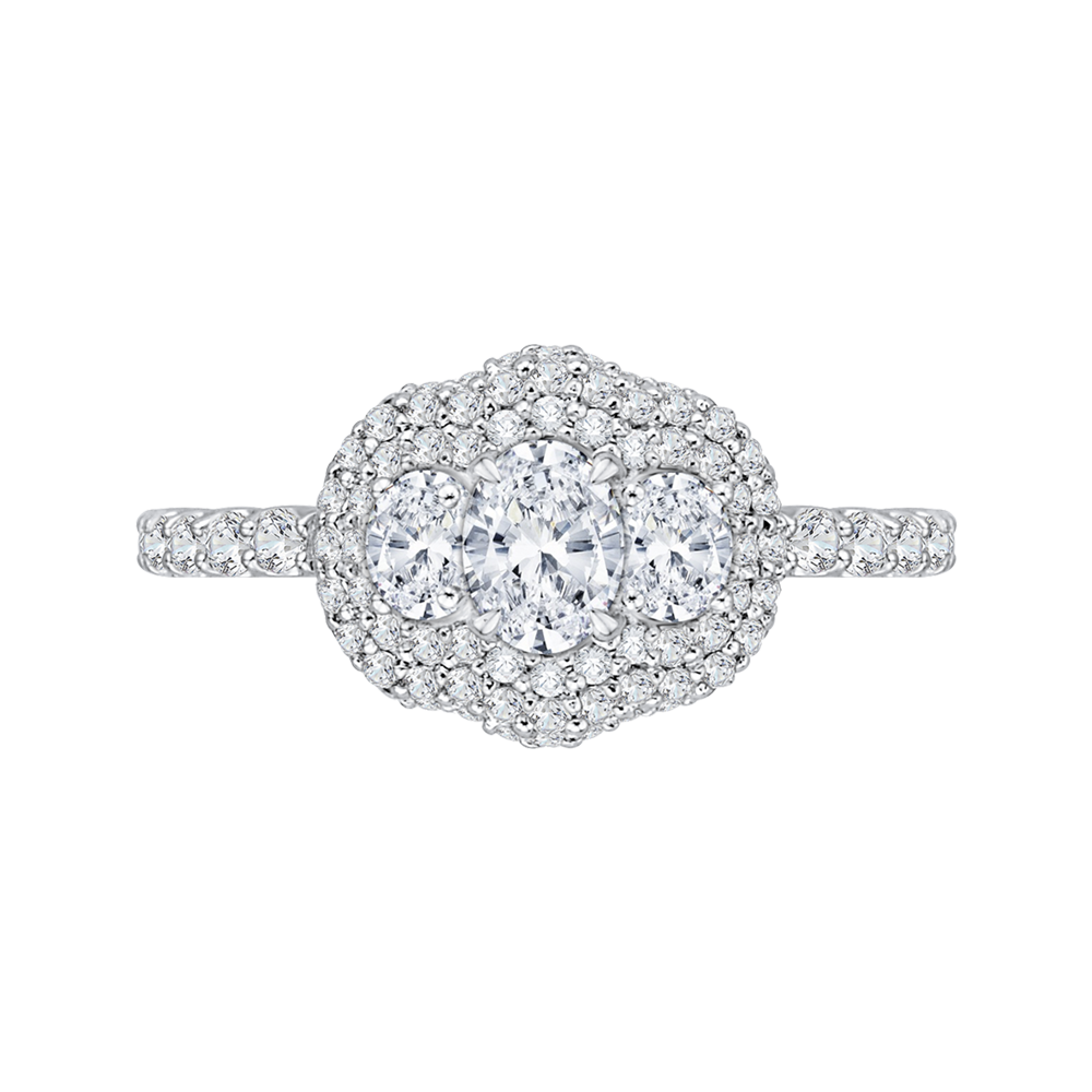 Oval Cut Diamond Three-Stone Halo Engagement Ring in 14K White Gold