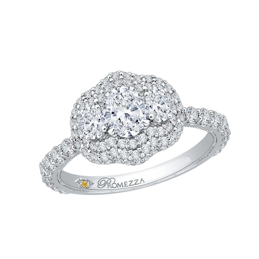 This exquisite engagement ring features a stunning oval cut diamond center stone, surrounded by two smaller diamonds on each side, all set in a timeless halo design. Crafted in lustrous 14K white gold, this ring exudes elegance and sophistication. A symbol of everlasting love and commitment, this three-stone halo ring is the perfect choice for a romantic proposal.