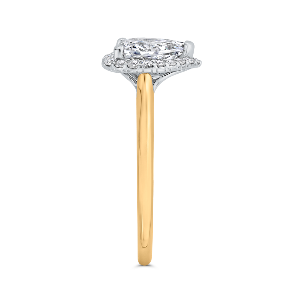 This exquisite pear cut diamond halo engagement ring exudes timeless elegance and sophistication. Crafted in 14K two tone gold, the semi-mount setting allows you to choose the perfect center stone to complete this stunning piece. A symbol of everlasting love and commitment, this ring is sure to capture the heart of your beloved.