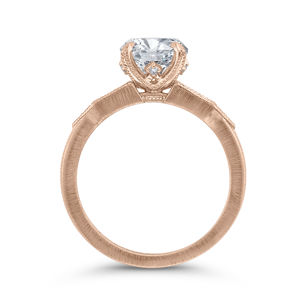 This exquisite engagement ring features a stunning combination of round and baguette cut diamonds set in lustrous 14K rose gold. The timeless design of this semi-mount ring allows you to choose the perfect center stone to create a truly personalized piece. With its elegant and classic style, this ring is sure to be cherished for a lifetime as a symbol of your love and commitment.