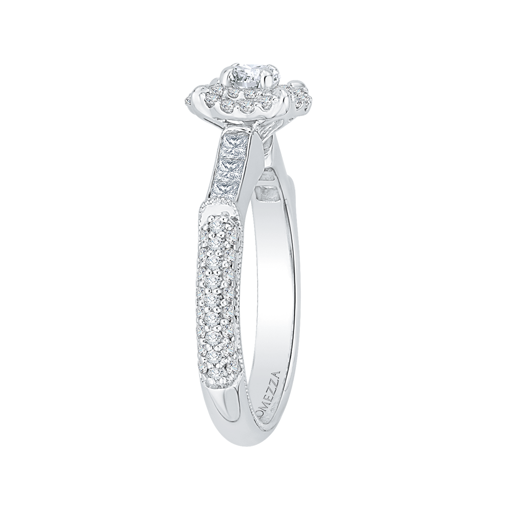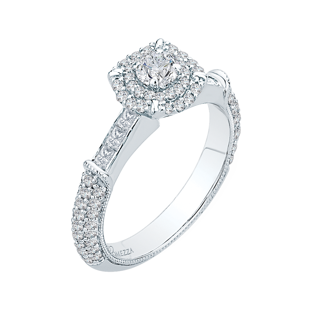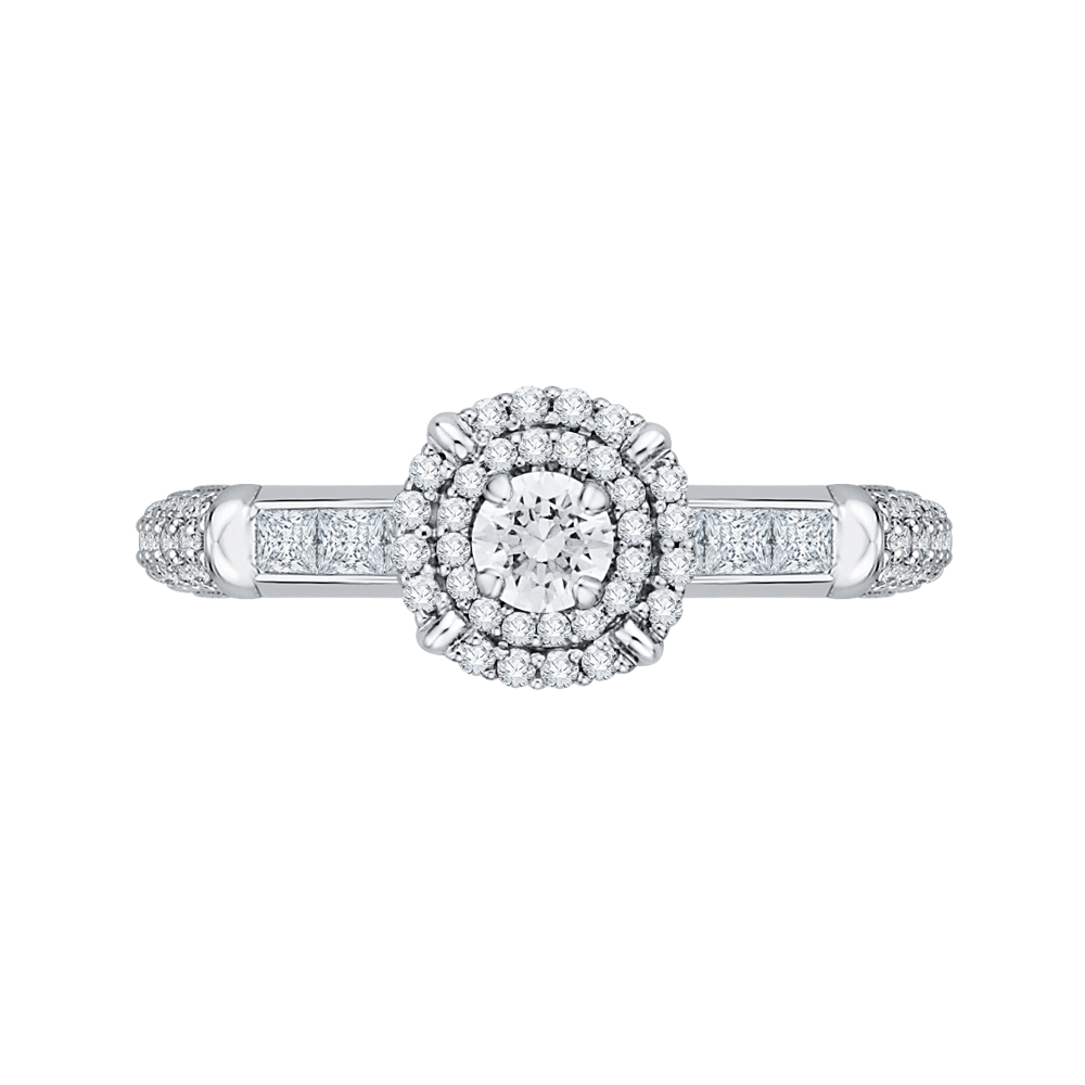 Round and Princess Cut Diamond Double Halo Engagement Ring in 14K White Gold