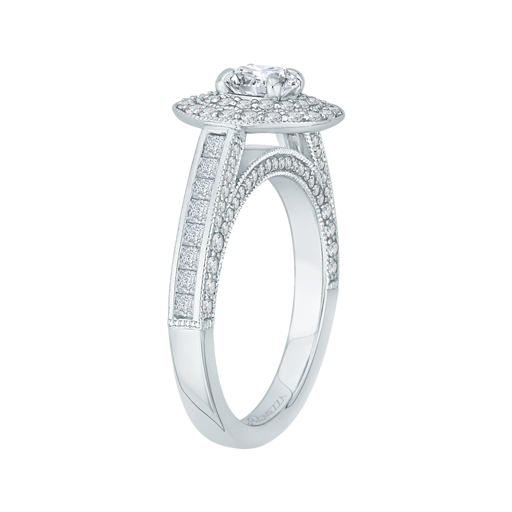 Round and Princess Cut Diamond Double Halo Engagement Ring in 14K White Gold