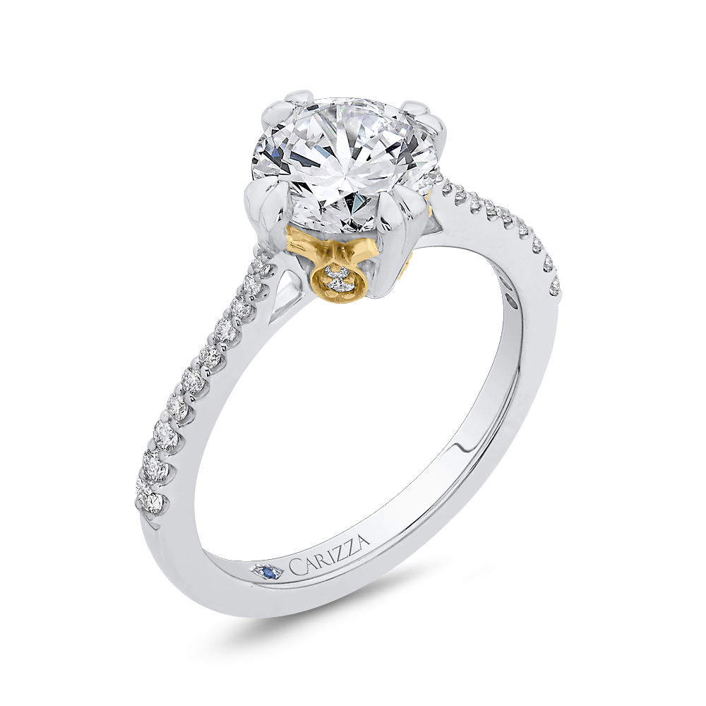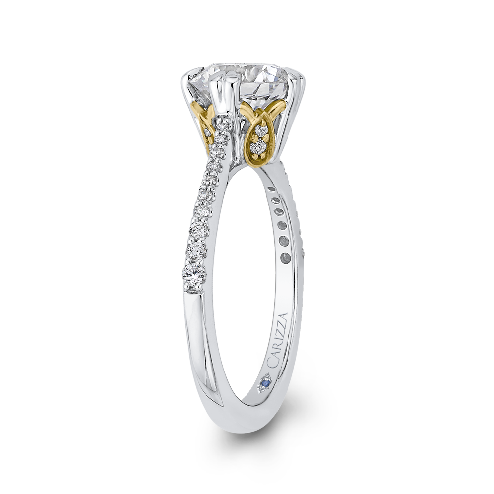 This exquisite engagement ring features a stunning round diamond set in a delicate floral-inspired design. Crafted in 14K two tone gold, the semi-mount setting allows you to choose the perfect center stone to complete this timeless piece. A symbol of everlasting love and commitment, this ring is sure to capture her heart.