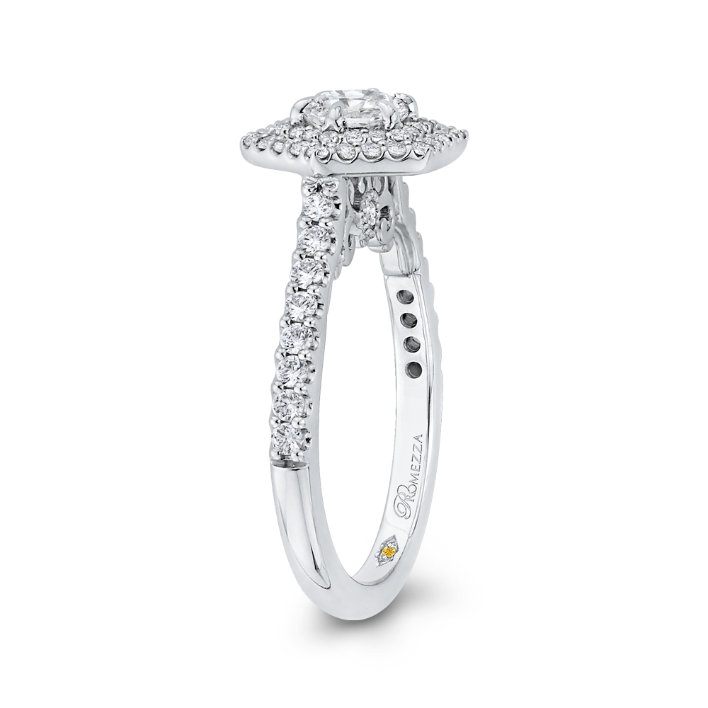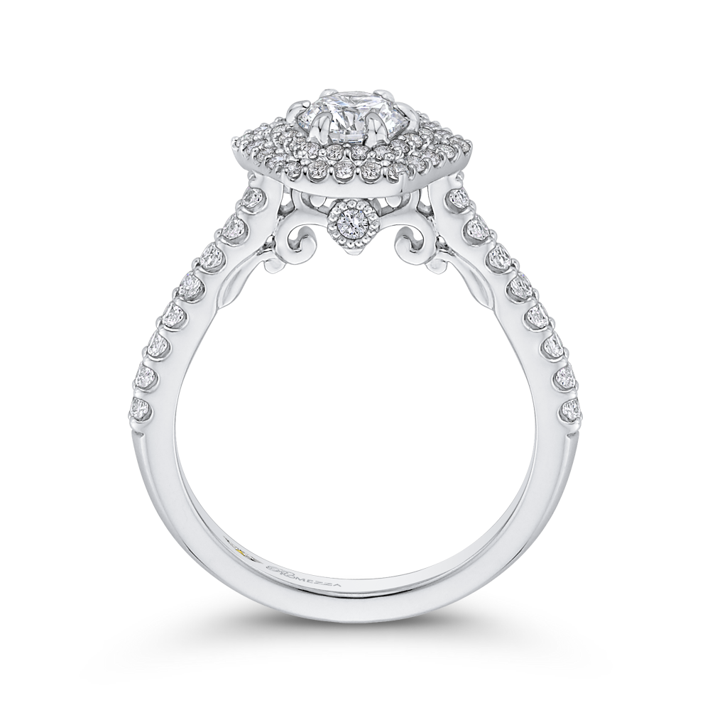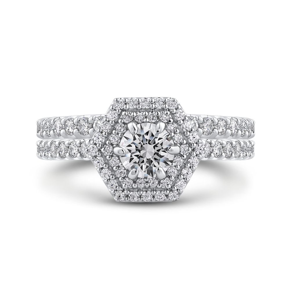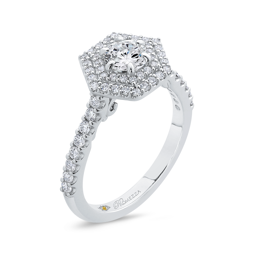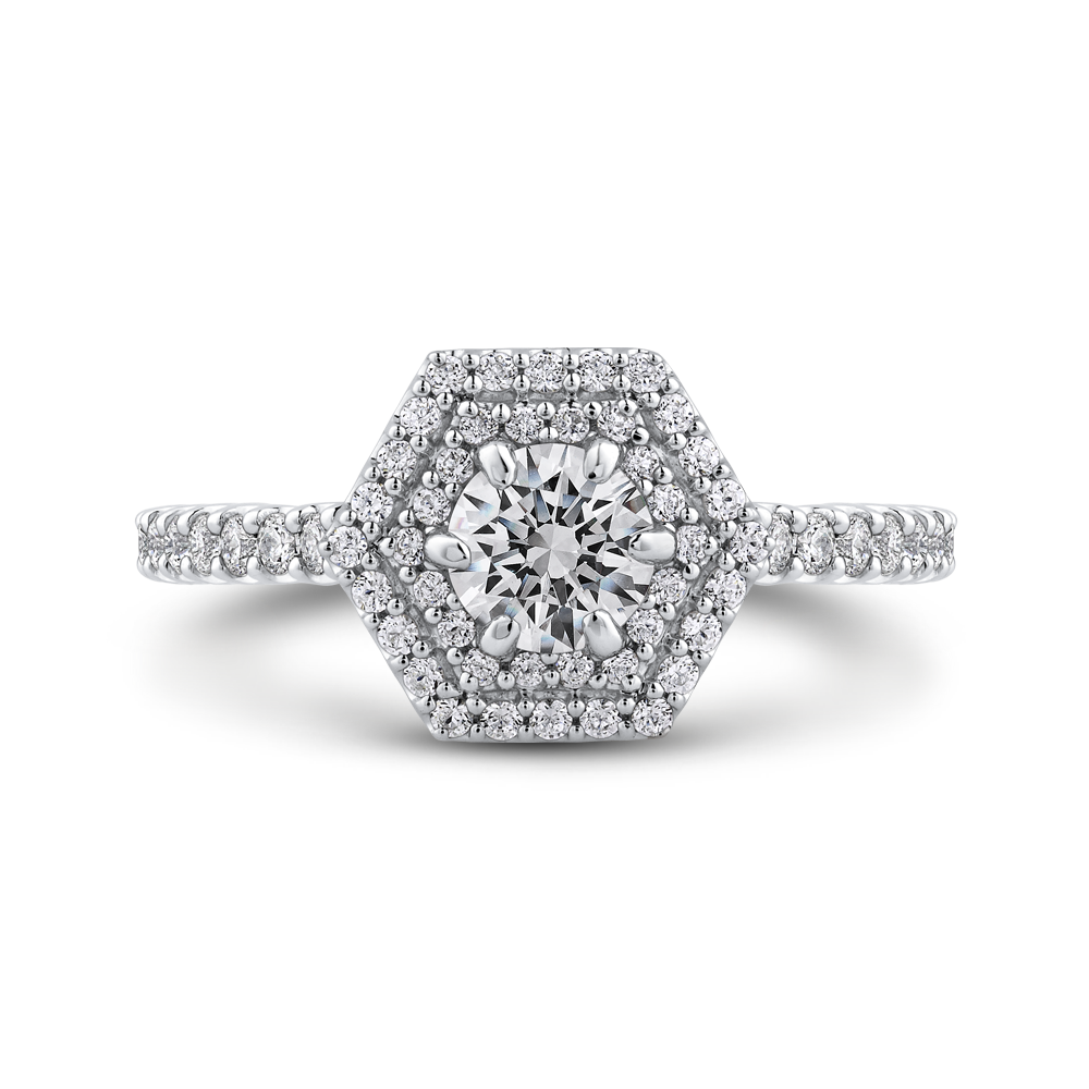 Round Diamond Hexagon Shape Double Halo Engagement Ring in 14K White Gold