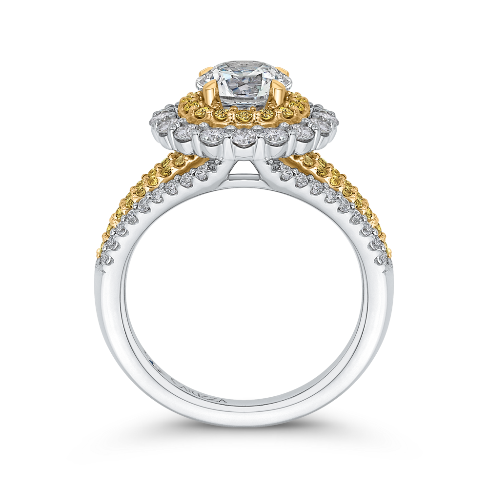 Elegantly crafted in 14K two-tone gold, this exquisite engagement ring features a split shank design adorned with a double halo of round diamonds. The semi-mount setting allows you to choose the perfect center stone to complete this timeless and sophisticated piece. Make a statement of everlasting love with this stunning and classic ring.