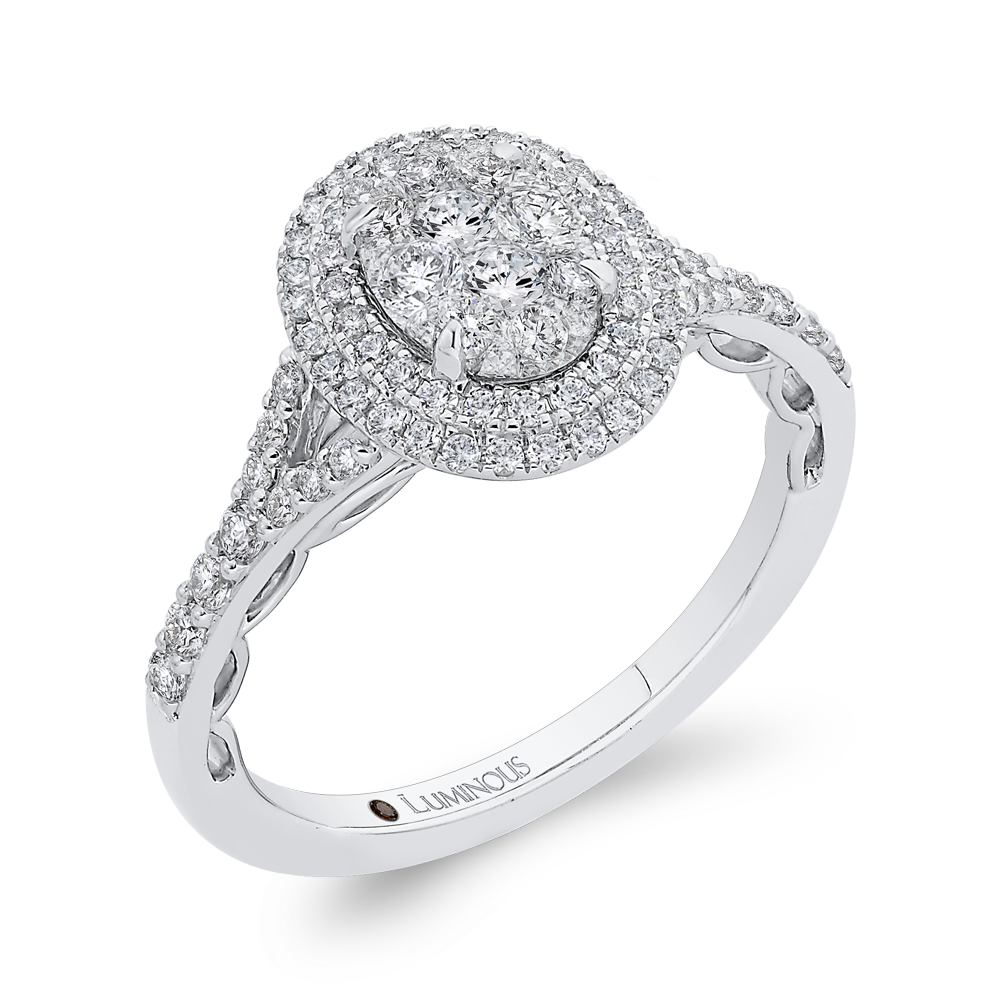 This exquisite engagement ring features a dazzling round diamond center stone surrounded by a double halo of smaller diamonds, creating a stunning and timeless look. The split shank design adds a touch of elegance and sophistication to this 14K white gold ring, making it the perfect symbol of everlasting love and commitment. A truly luxurious choice for the one you love.