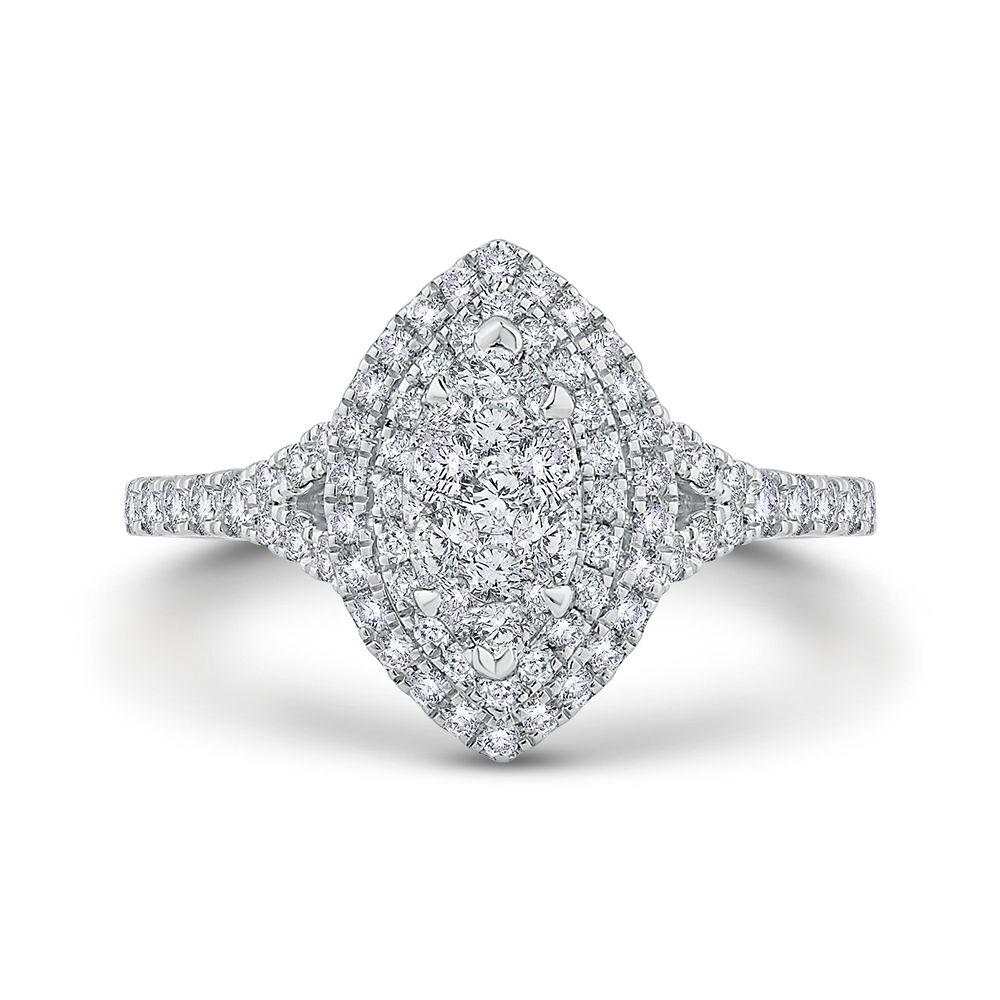 Elegantly crafted in 14K white gold, this exquisite engagement ring features a stunning marquise cut diamond surrounded by a double halo of sparkling round diamonds. The split shank design adds a touch of sophistication and glamour to this timeless piece, making it the perfect symbol of everlasting love and commitment. Make a statement with this classic and elegant ring that will surely capture her heart.